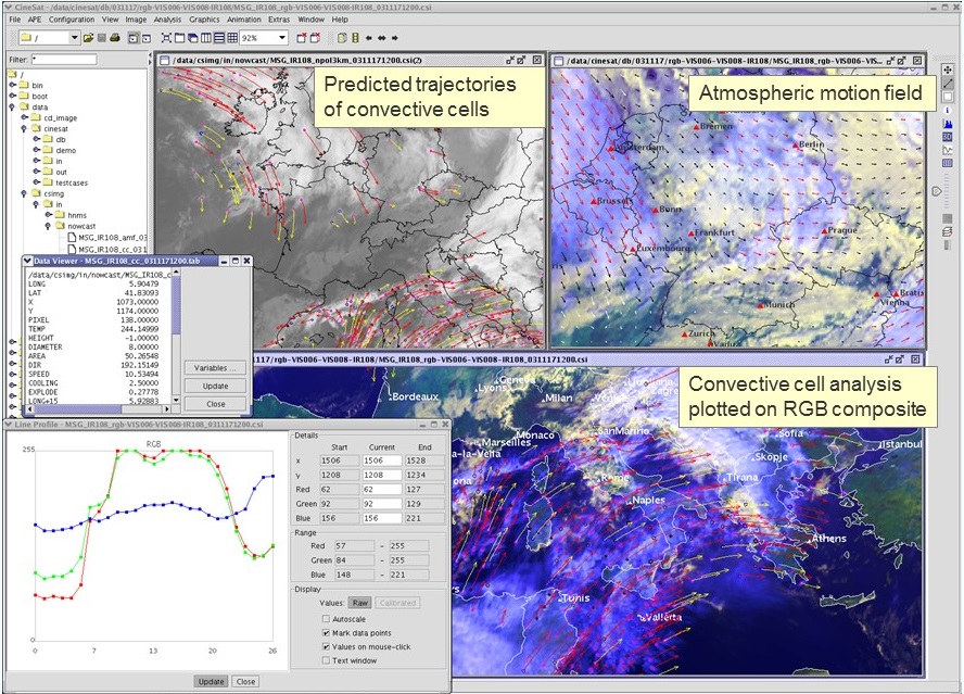 CineSat is a powerful, high-performance, and feature-rich meteorological software suite for satellite image analysis, display, and processing. It features a real-time weather analysis and forecasting module based on satellite imagery, a high-performance and highly-configurable Automatic Product Extraction Server with a number of unique functions, and a strong and fast data display.